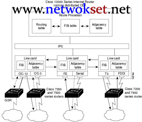 أما الوضعية الثانية والتى يطلق عليها Distributed CEF فهي مخصصة لأنواع قليلة من الأجهزة وهي على حد علمي موجودة في روترات series 12000 وسويتشات 6500 اما عن آلية عملها والتى تشرح الفائدة الثانية في الـCEF فهي تتركز في عمل نسخة للـCEF table ووضعها على كل Line Cards وبالتالي سوف يكون لكل Card الجداول الخاصة به وسوف يعمل بشكل منفصل عن الآخرين والصورة القادمة سوف توضح كل شيء
