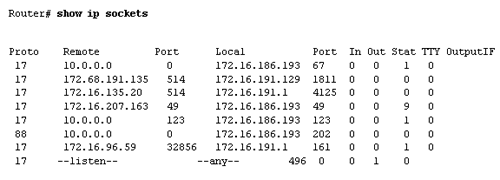 أحد الأوامر المدعومة في أغلب أصدارت سيسكو IOS وابتدأ من 10.0وهو يقوم بعرض currently open IP sockets in use by the device (لم أستطع أن أعبر عنها بغير طريقة فتركتها بلغتها ) ومشكلته أنه لايقوم بعرض الـSocket الخاص بي الـ TCP ومفيد في عرض الـUDP Connections والـ None TCP/UDP مثل الـ OSPF EIGRP
