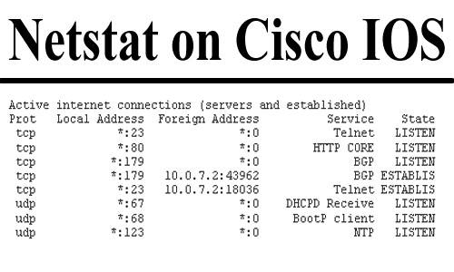بعد شرحي لكيفية عمل Ping و Trace route طلب مني أحد الأصدقاء أن أقوم أيضا بشرح عمل الأمر Netstat وقد جوابته أن هذا الأمر خاص بمايكروسوفت فقط وأنه لايوجد مثل هذا الأمر في سيسكو وقد كنت مخطأ حينها فمثل هذا الأمر موجود وبعدة صيغ وجميعها تعطينى نفس النتائج وهي عرض الأتصالات والبورتات المفتوحة بالأضافة إلى حالة الأتصال